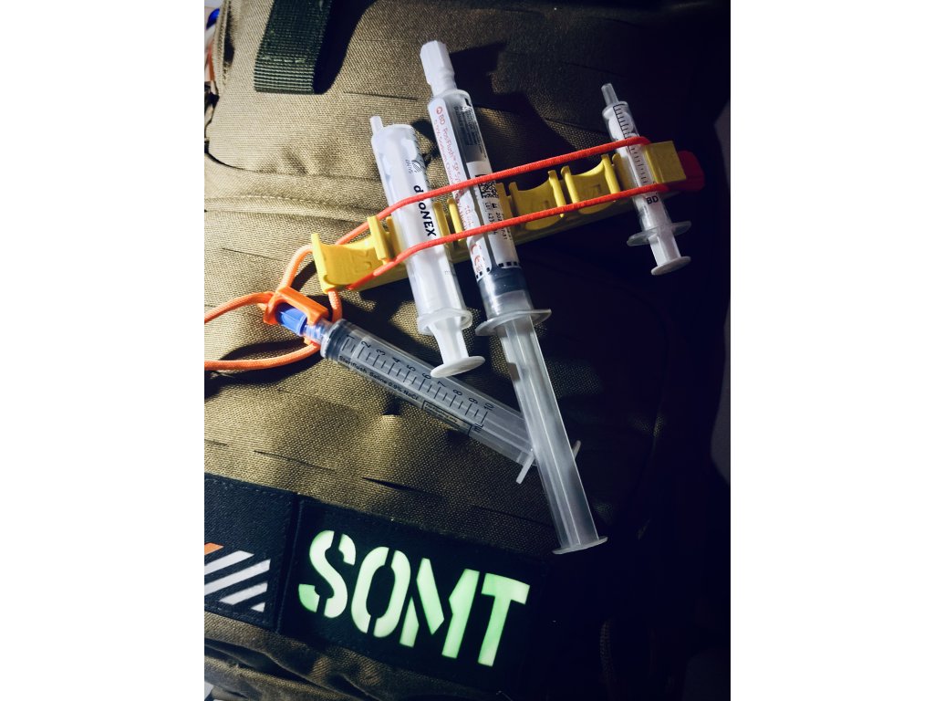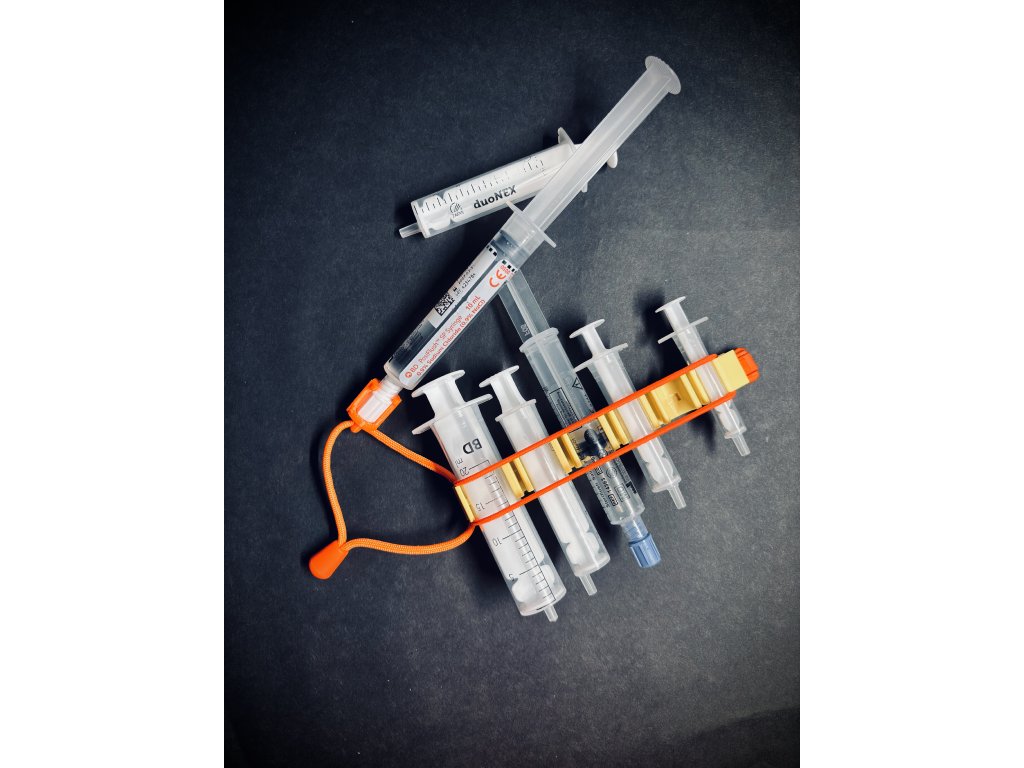 Představujeme vám druhou verzi našeho držáku injekčních stříkaček. Po první generaci jsme vyslyšeli vaše nápady a integrovali je do této novinky. Přidali jsme jistící bungee cord, který lze využít i k přichycení držáku na různé objekty. Upravili jsme velikost zarážek a přidali jistící pin, díky kterému v držáku pevně sedí všechny běžné druhy a šarže stříkaček. Do pozic pro 10ml objem se nyní bezpečně vejdou jak klasické, tak přednaplněné stříkačky.