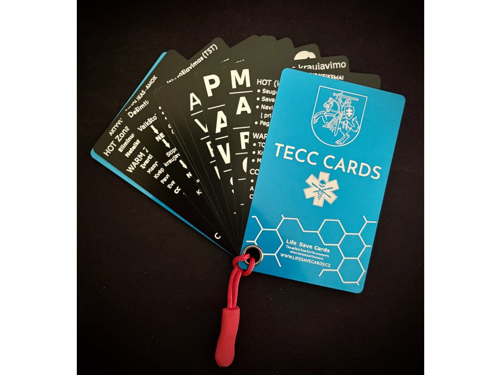 TECC orientuojasi į greitą reagavimą ir efektyvų pagalbos teikimą pavojingomis sąlygomis, pabrėžiant tolesnės grėsmės nukentėjusiajam ir gelbėtojui minimizavimą. Šis kortelių rinkinys yra tinkamas policijos pareigūnams. Rinkinys paremtas kortelėmis, sukurtomis kartu su Čekijos Respublikos Policijos prezidiumo sveikatos (medicininio) parengimo skyriumi, ir buvo konsultuotas bei koreguotas Lietuvos policijos pareigūnų.